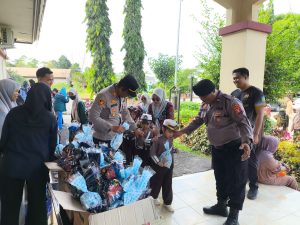 Selain berbagi bingkisan, anggota Polsek juga memperkenalkan lingkungan kepolisian kepada anak-anak secara ramah dan edukatif.