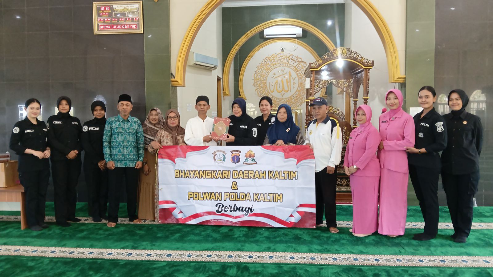 Hadir Bhayangkari Bidhumas Polda Kaltim Ny. Ayu Biharul dan Ny. Rianti Gantang, serta delapan personel Polwan Bidhumas Polda Kaltim dipimpin AKBP Qori Kurniawati, S.E. Kehadiran mereka disambut hangat pengurus masjid dan warga Bukit Damai Lestari 2.